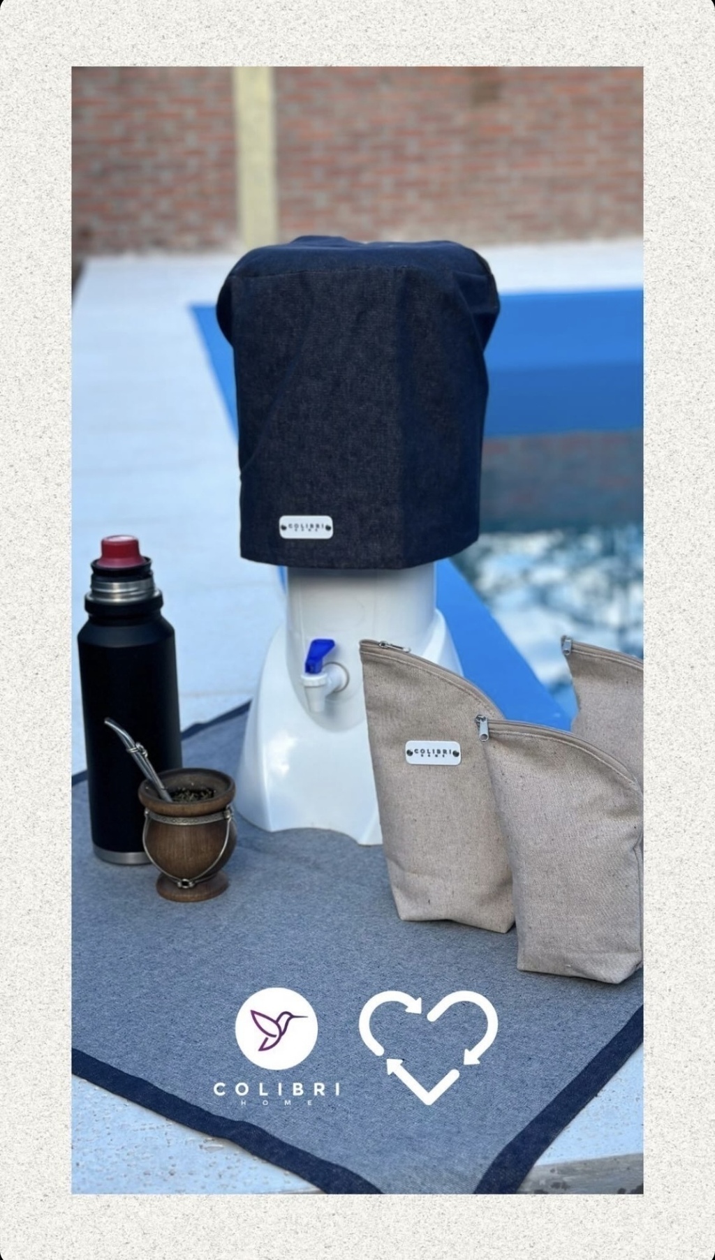 Cubre bidón de agua de 20 litros, realizado en tela sustentable, 80% recuperada, sin teñir. Confeccionada en talleres sociales.